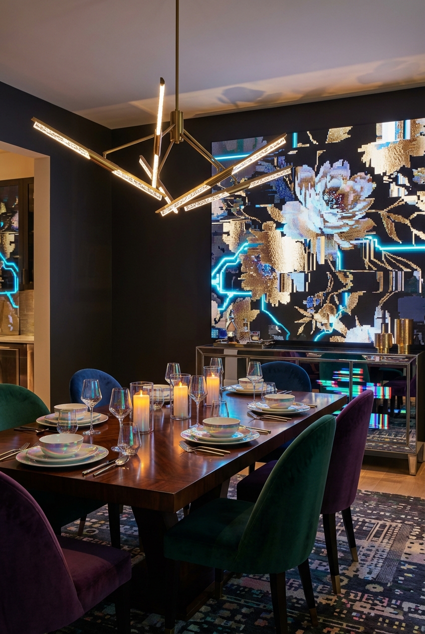 Designing a Glitchy Glam dining room is about embracing the unexpected. It is a rebellion against the beige and the boring.