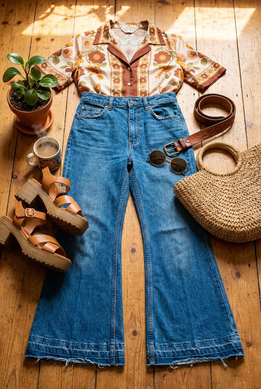 Platform boots, block heels, and wedges are the best choices. The platform provides the height needed to keep the hem off the ground without putting your foot at an uncomfortable arch angle. A 70s-inspired wooden clog or a platform boot with a square toe offers the perfect resistance to the denim.