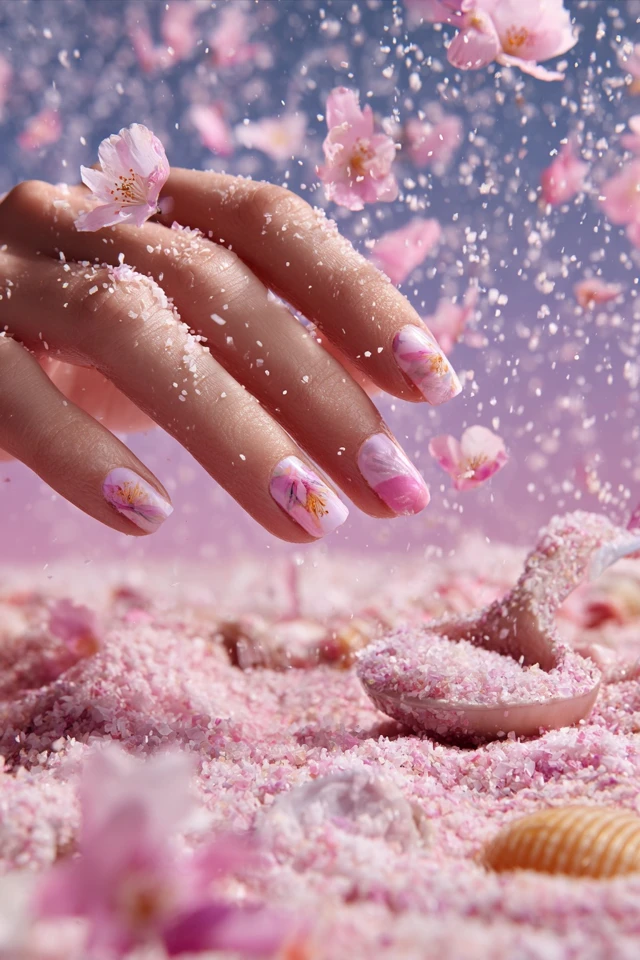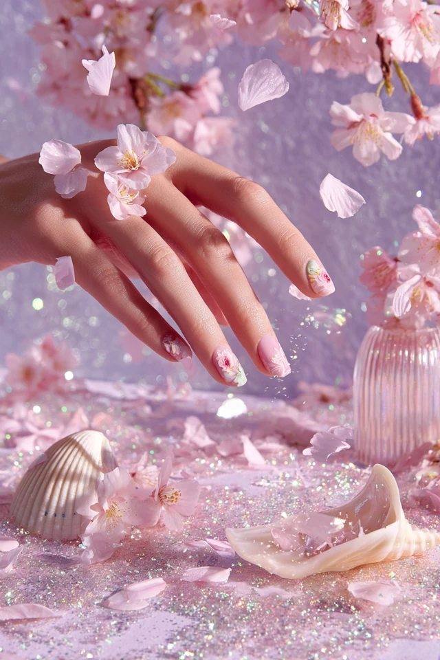 - A: Oval and almond shapes enhance femininity and mimic natural petals, reinforcing the blossom theme. Rounded nails also complement soft nuances and everyday wearability.