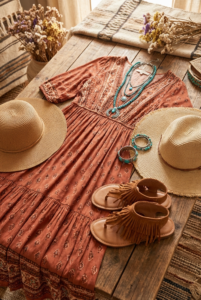 Styling a boho maxi dress for a festival is about balancing the fantasy of the event with the reality of the environment. It is about choosing fabrics that move with the wind, prints that hide the dust, and boots that let you dance until sunrise.