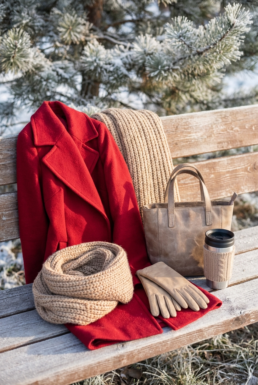 The hardware on your coat—buttons, zippers, and buckles—acts like jewelry. In the red and beige color scheme, the metal tone changes the vibe entirely.