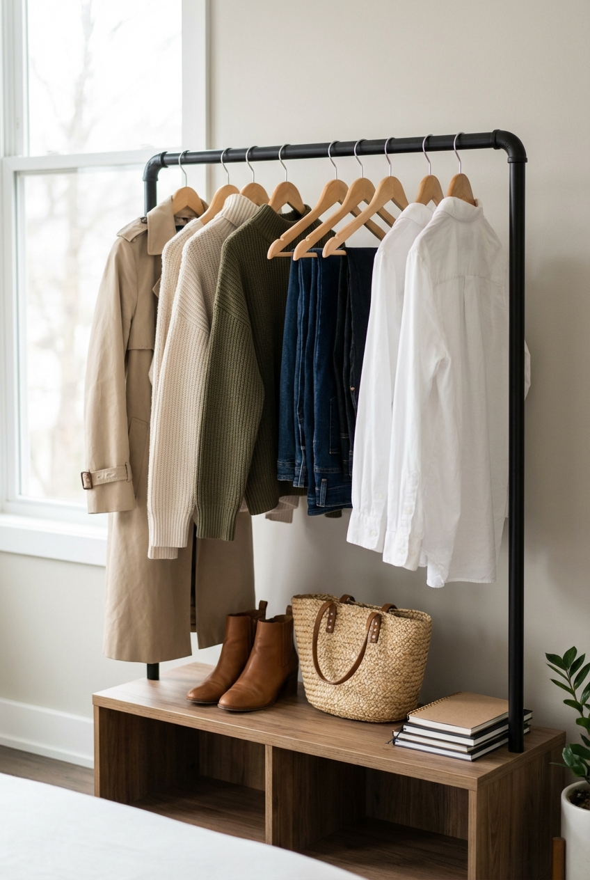 - Concealed: Off-season items (puffer coats in July) go into opaque bins or a guest closet to reduce visual noise.