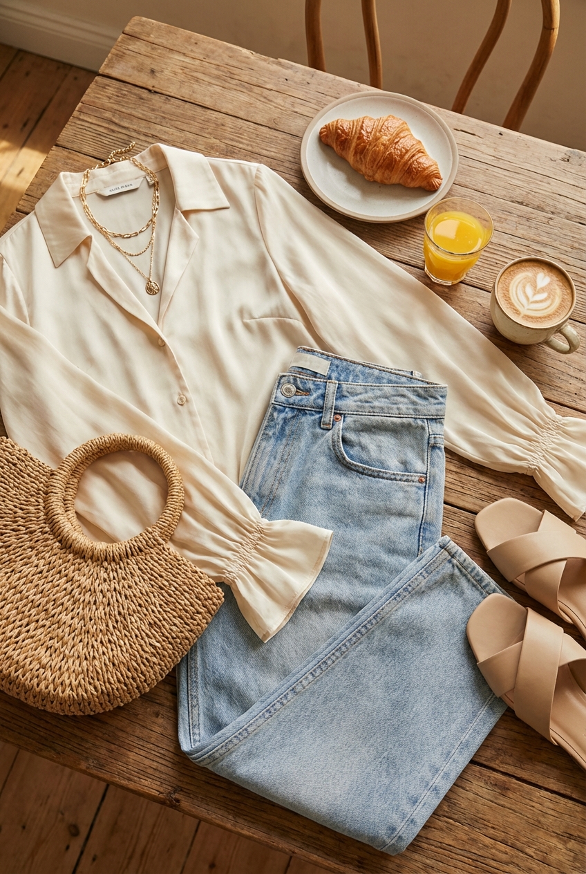 The most coveted brunch aesthetic is the “high-low” mix. This means pairing a highly feminine, expensive-looking blouse with distressed or relaxed denim. This juxtaposition creates a sense of effortless style that is very Parisian.