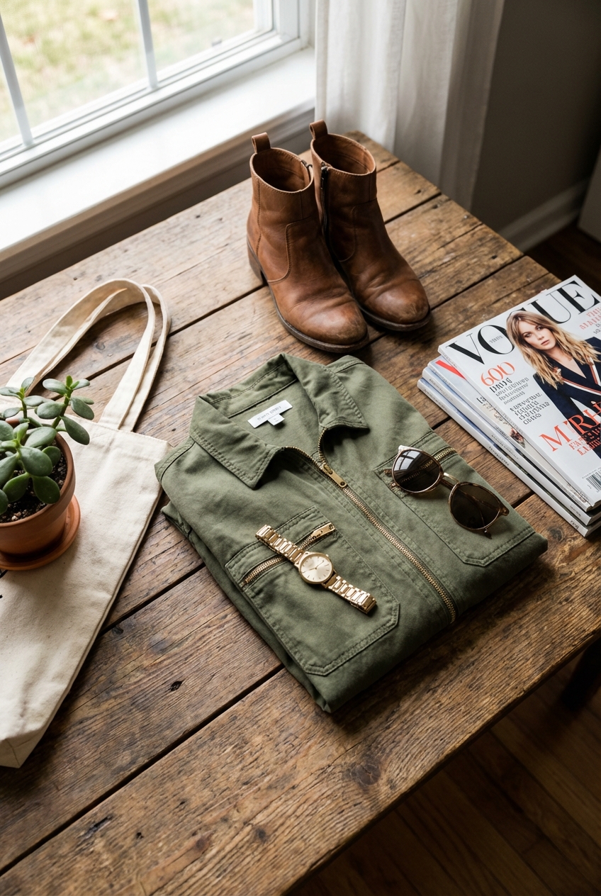 Jewelry: This is where you go bold. Utility fabrics are matte and heavy, so they pair beautifully with shiny gold. Think chunky chain necklaces or oversized gold hoops.