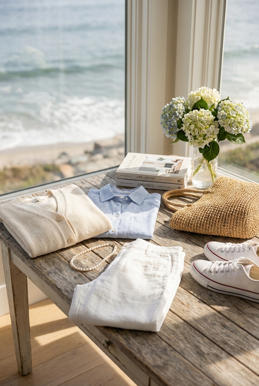 The color story for this aesthetic is incredibly disciplined. We are avoiding neon, stark blacks, and busy geometric prints. The goal is to mimic the colors found in a coastal landscape: sand, sea, clouds, and garden blooms.