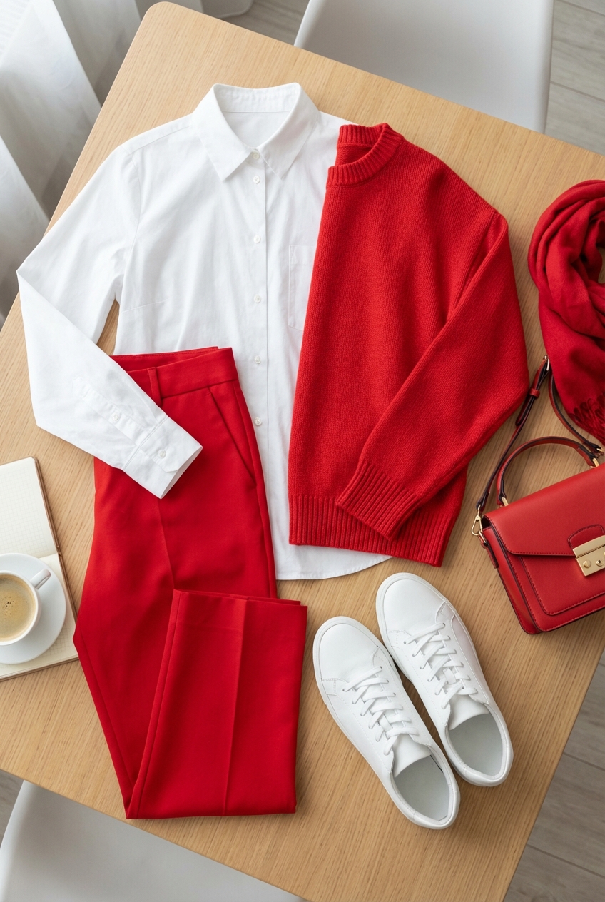 In design, we often talk about the 60-30-10 rule. In fashion, specifically with a bi-color palette like red and white, you need to decide on your dominant shade to avoid looking like a sports team uniform. Splitting your outfit exactly 50/50—like red pants and a white shirt—can cut your body in half visually.
