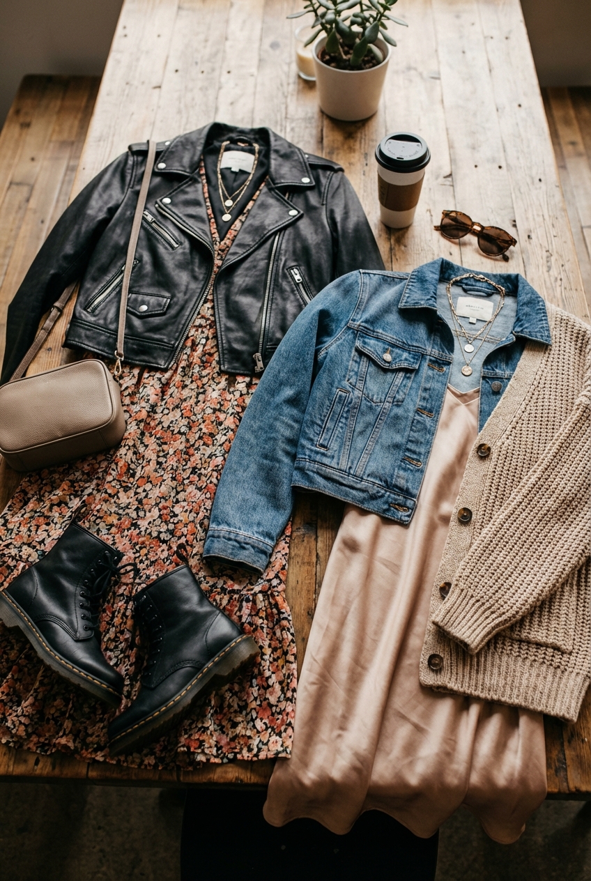 A leather moto jacket is the classic choice, but the weight creates a styling challenge. Heavy cowhide can physically crush delicate fabrics like silk or rayon. For lighter dresses, I always source lambskin or soft vegan leathers that drape rather than sit stiffly. The hardware also plays a massive role here; heavy zippers add jewelry-like elements to the look.
