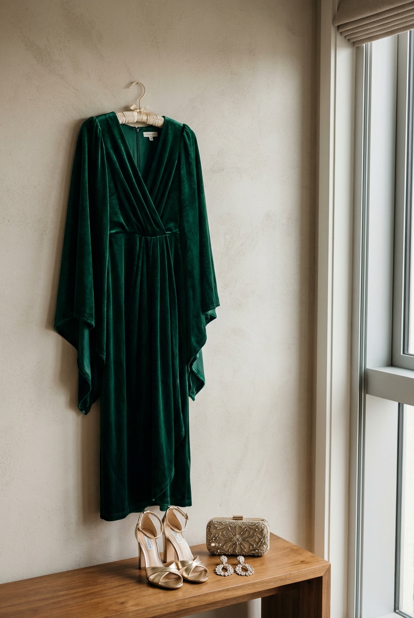 For jewelry, skip the necklace. Cape dresses usually have high necks or significant shoulder detailing. Adding a necklace creates visual clutter. Instead, invest your budget in statement earrings. Large drop earrings or architectural studs draw the eye up to the face and balance the width of the cape.