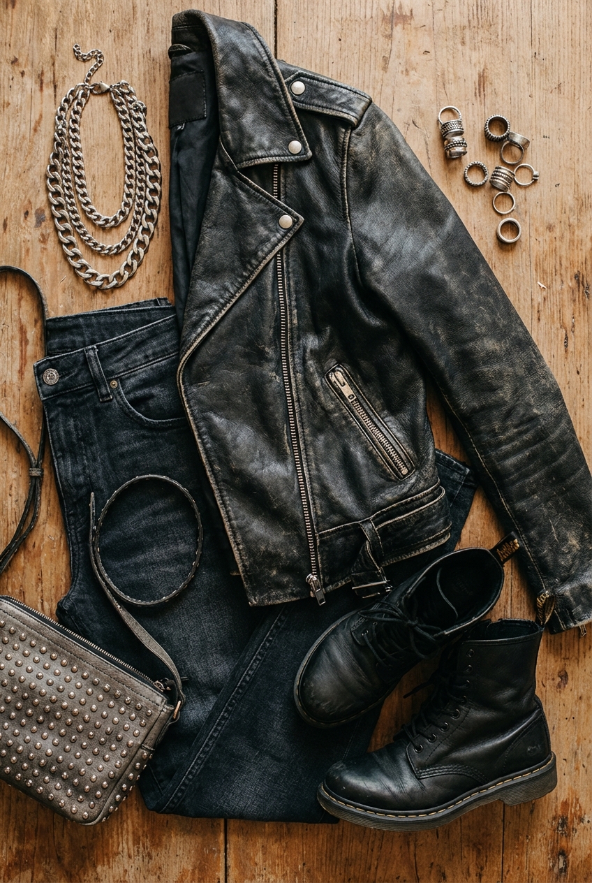 It depends on the jacket. If the jacket is plain and minimal, a studded bag or belt adds necessary texture. If the jacket itself is studded or heavily zipped, adding studded accessories will look like a costume. In that case, switch to smooth, minimal leather accessories to let the jacket be the star.