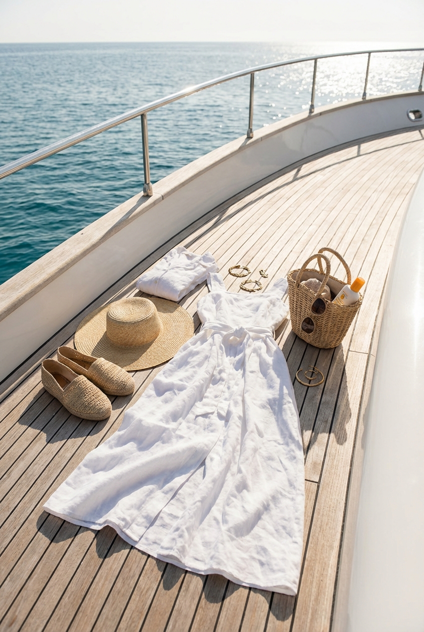 Alternatively, an oversized white linen button-down shirt worn open over a slip dress creates a chic, monochromatic layered look. This protects your shoulders from the afternoon sun and cuts the evening chill. Avoid denim jackets, which can feel too heavy and casual for a luxury marine setting.