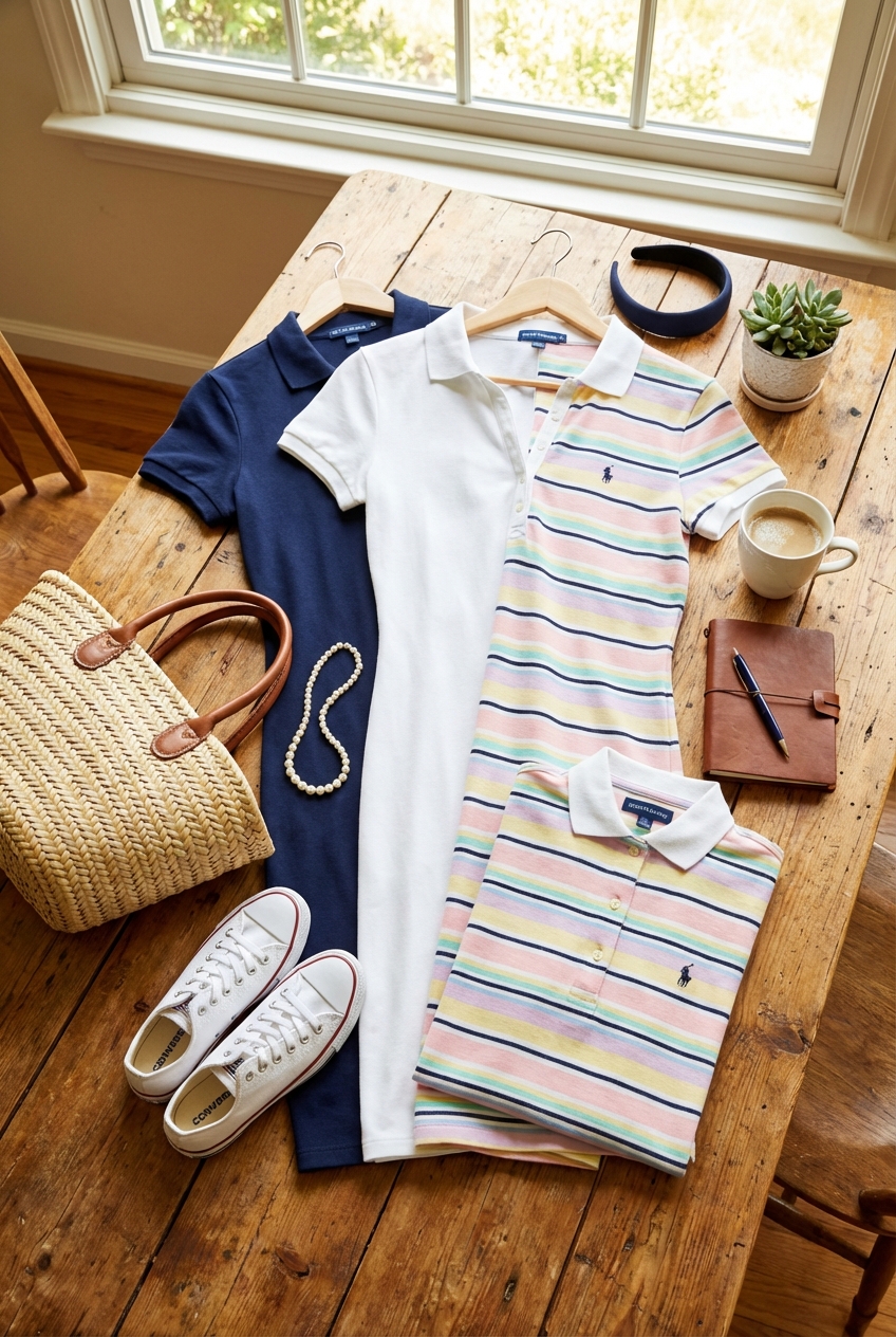 Accessories for a polo dress should lean into structure and heritage rather than bohemian or eclectic styles. The preppy aesthetic is defined by intentionality and polish.