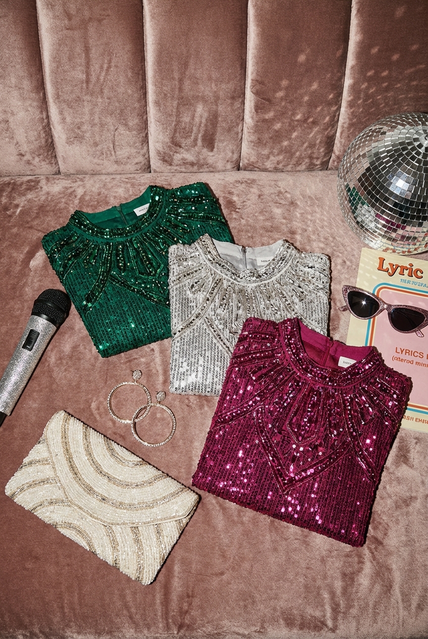 - Necklaces: If your top is the statement, keep the neck bare or wear a delicate chain. Don’t let jewelry compete with sequins.