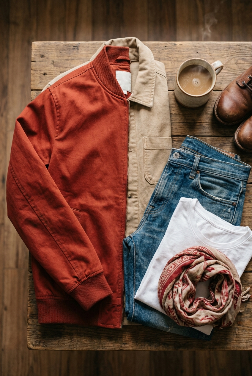 For the red element, look for matte textures. A boiled wool bomber, a suede moto jacket, or a heavy cotton canvas utility jacket adds depth. These fabrics soften the intensity of the red, making it feel rich rather than jarring.