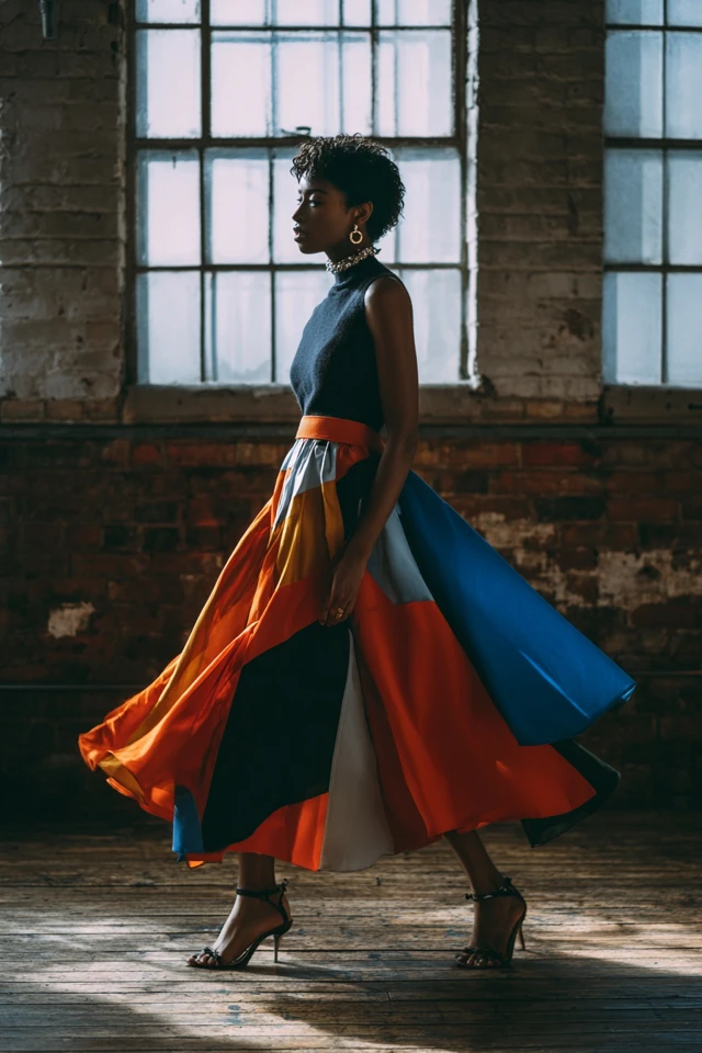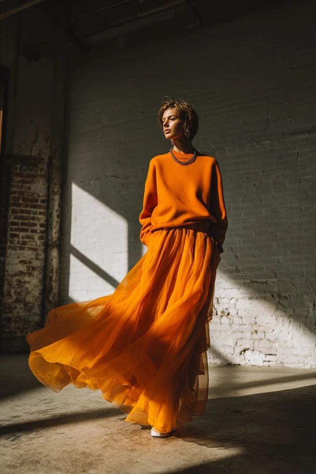 - Layering: Experiment with layering skirts of different textures for multidimensional looks — for example, a silk tier beneath a sheer chiffon one. Also, layer tops to balance volume, such as fitted turtlenecks under structured jackets.