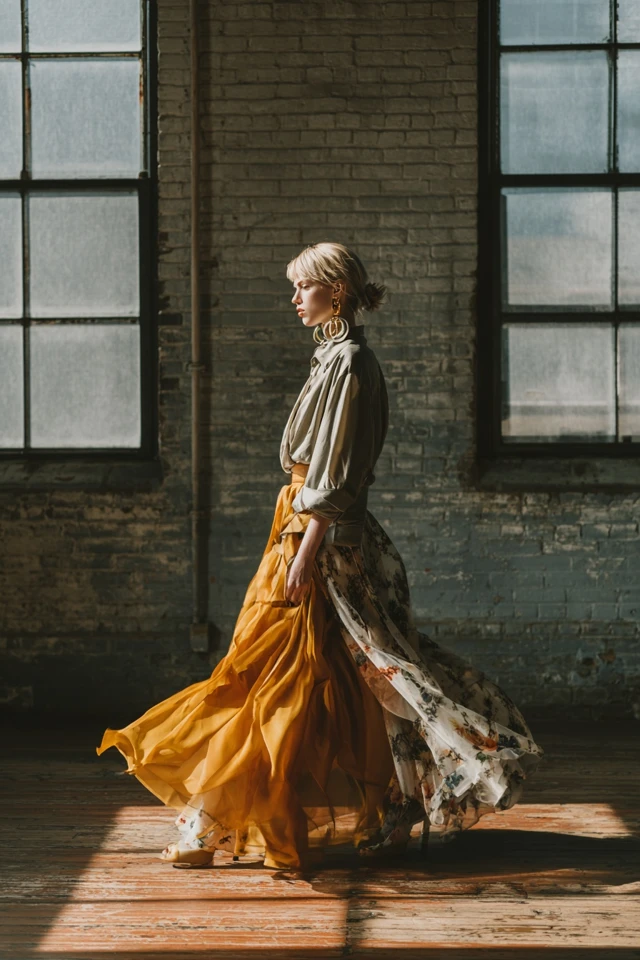 - Layering: Experiment with layering skirts of different textures for multidimensional looks — for example, a silk tier beneath a sheer chiffon one. Also, layer tops to balance volume, such as fitted turtlenecks under structured jackets.