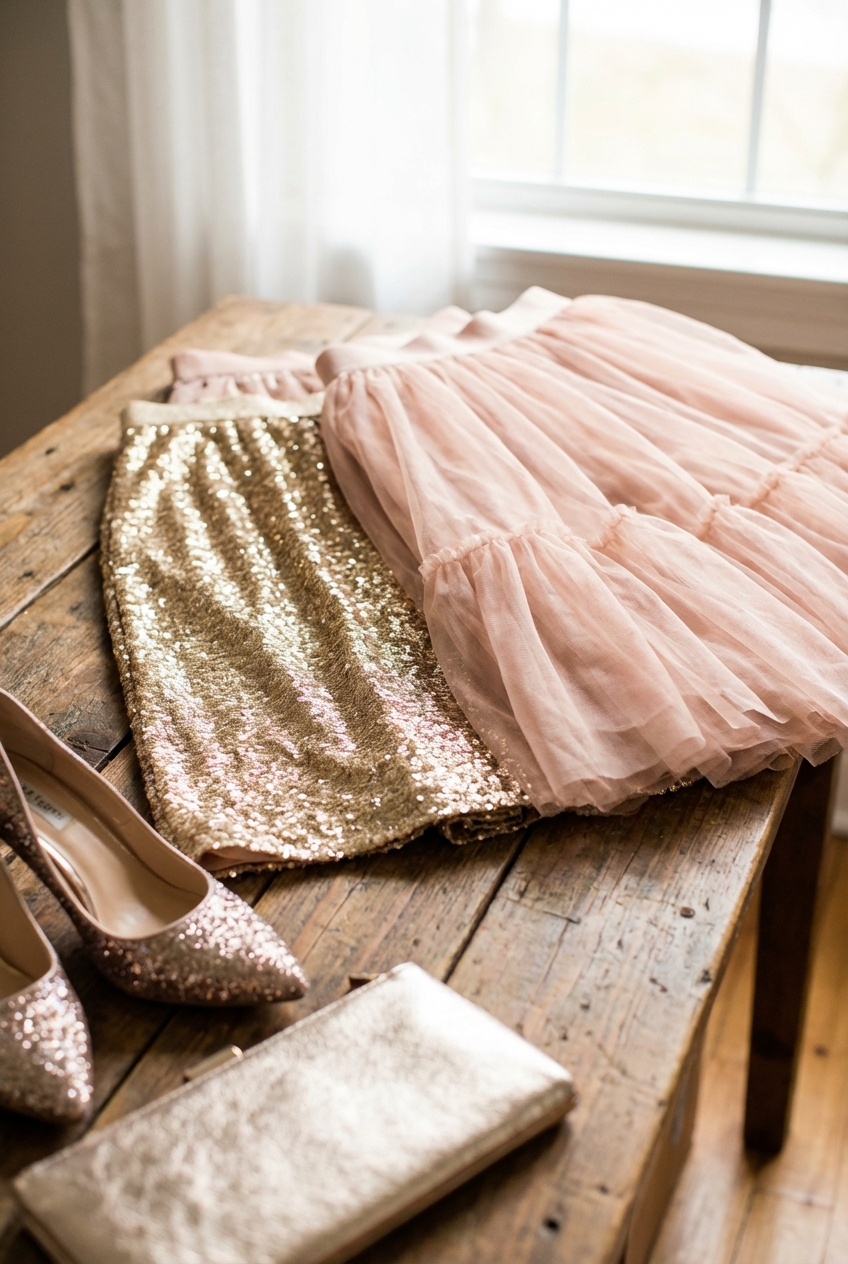 The shoe choice dictates the vibe of the outfit. With tulle and metallics, you are already wearing a “loud” garment. Your shoes should either complement the elegance or provide a deliberate contrast.