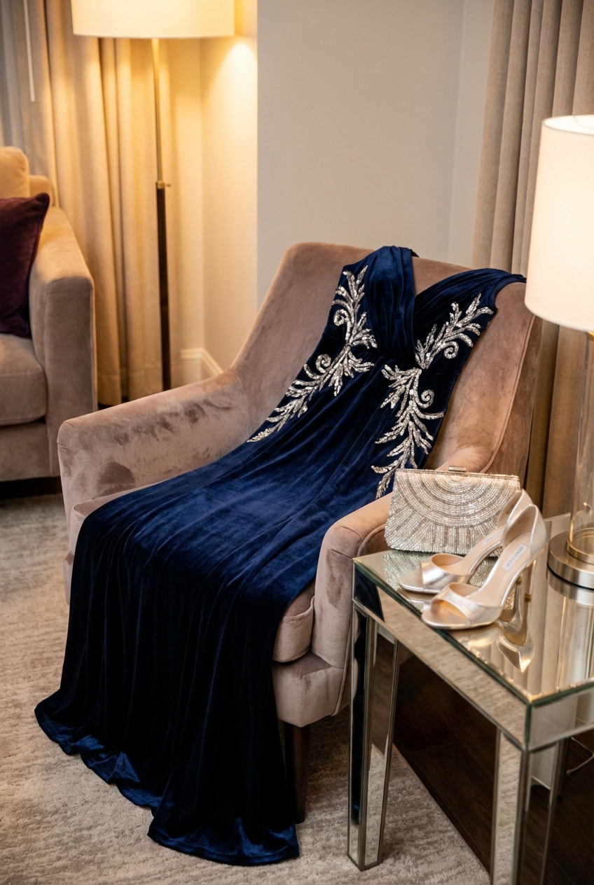 I remember dressing a client for a winter gala who was terrified of wearing color. She insisted on black until I pulled a midnight velvet column gown with silver thread embroidery along the bodice. The cool undertones of the blue brightened her complexion instantly, and the silver acted as a built-in illuminator. It wasn’t just a dress; it was a lighting strategy for her skin.
