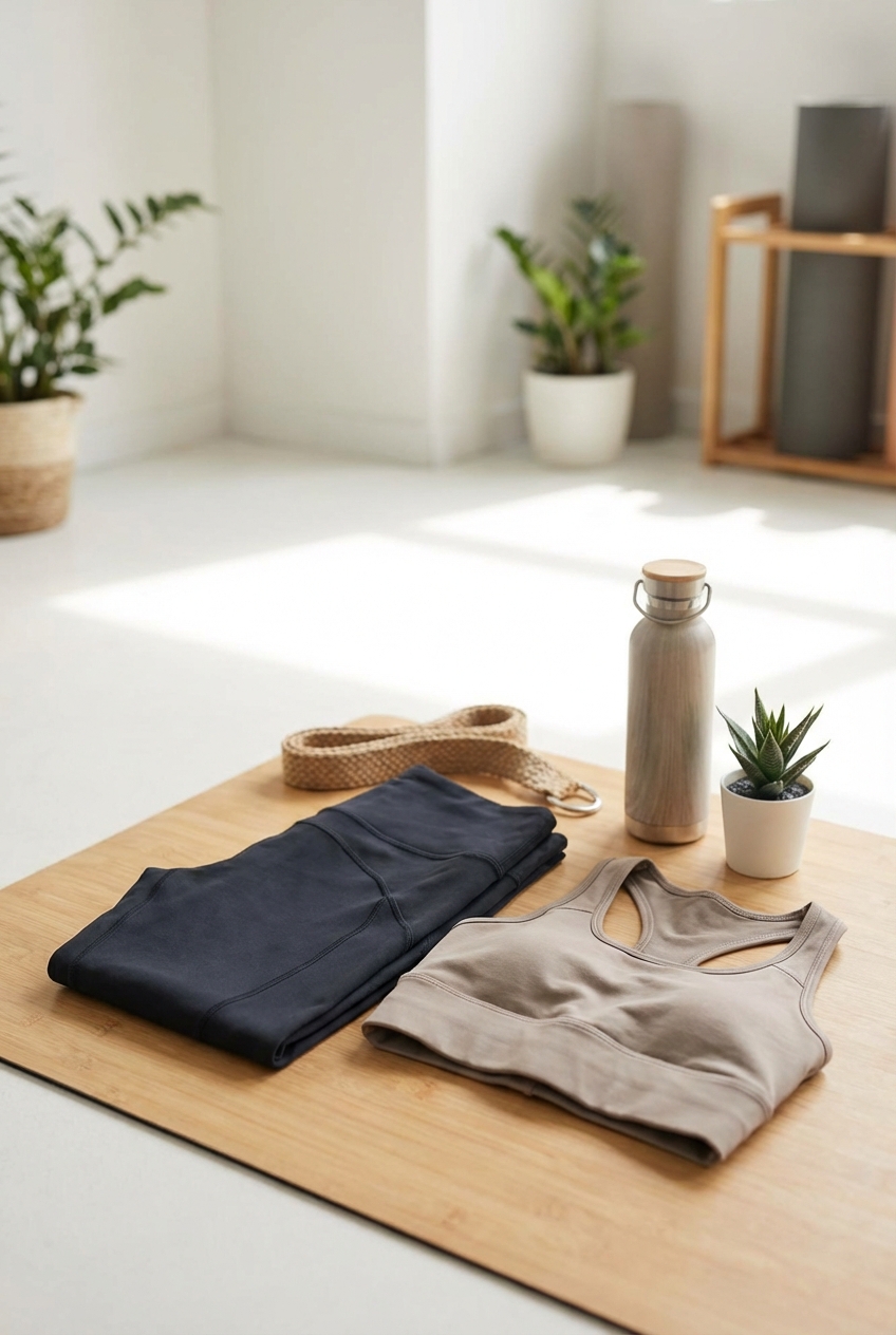 For clients with slippery floors, I overlay a thin, non-slip jute rug underneath the rubber yoga mat. This adds an organic, “wabi-sabi” texture that softens the high-tech look of sculpted leggings without sacrificing stability.