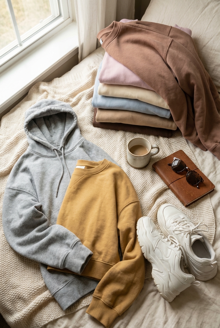 Matching sets are the easiest way to achieve a high-end look with zero effort. When your oversized sweatshirt matches your joggers exactly in tone and texture, it creates a vertical column of color that lengthens the body. Neutrals like oatmeal, camel, charcoal, and navy are timeless and hide wear better than pastels.