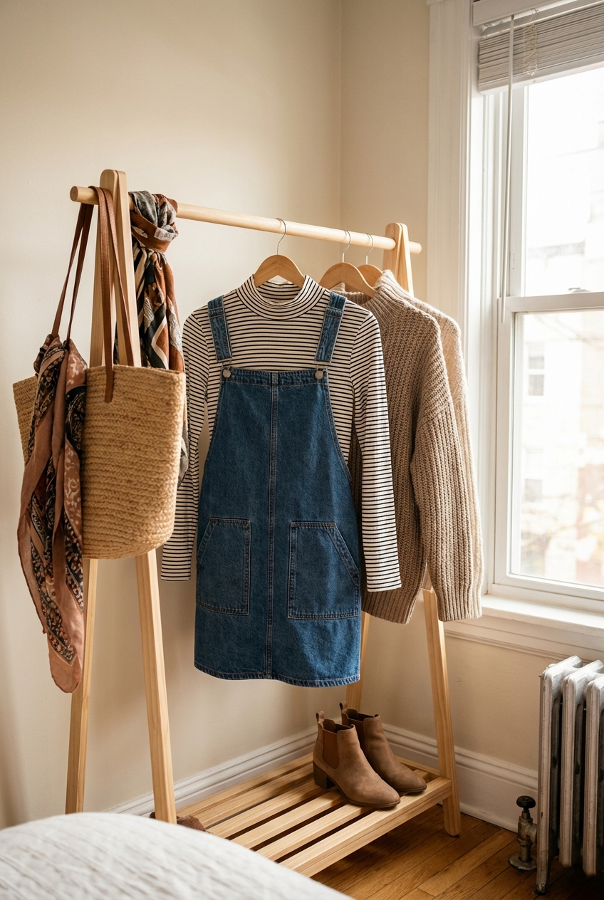 Crossbody bags can be difficult with pinafores because the strap of the bag fights with the strap of the dress. A top-handle bag or a structured tote is a cleaner choice. It keeps the silhouette of the torso uninterrupted.