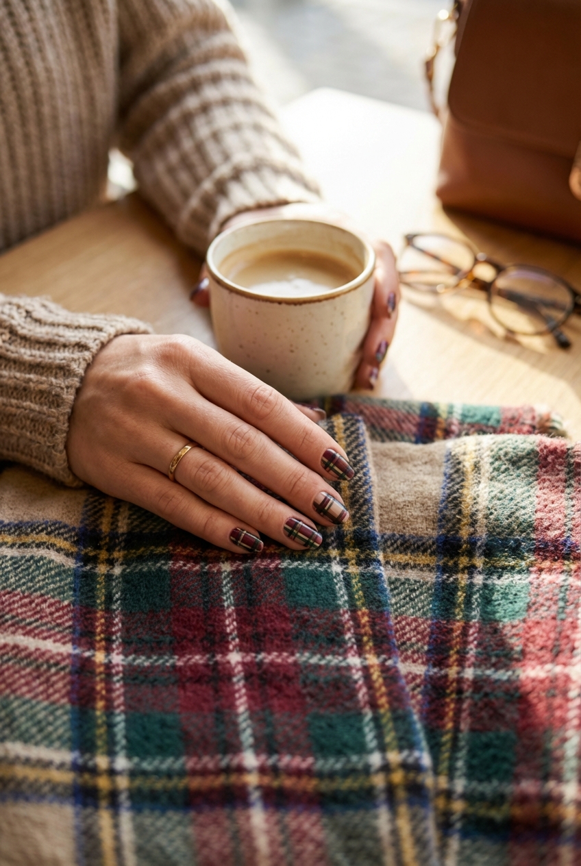 When styling a photoshoot, we often adjust prints based on the model’s proportions; the same logic applies to nails. If you have shorter nail beds, opt for a “windowpane” or open grid plaid. Dense, complex tartans can make short nails look smaller and cluttered.