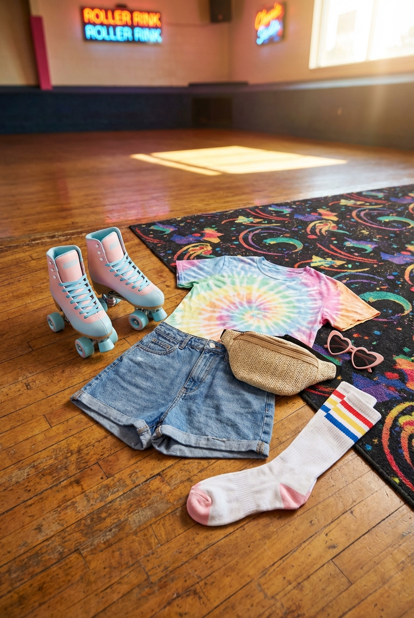 Roller rink style is defined by its fearlessness with color. In fashion, we call this “dopamine dressing,” and the same applies to interiors. We are looking at two distinct directions: the moody “Midnight Disco” palette or the bright “Venice Beach” palette.
