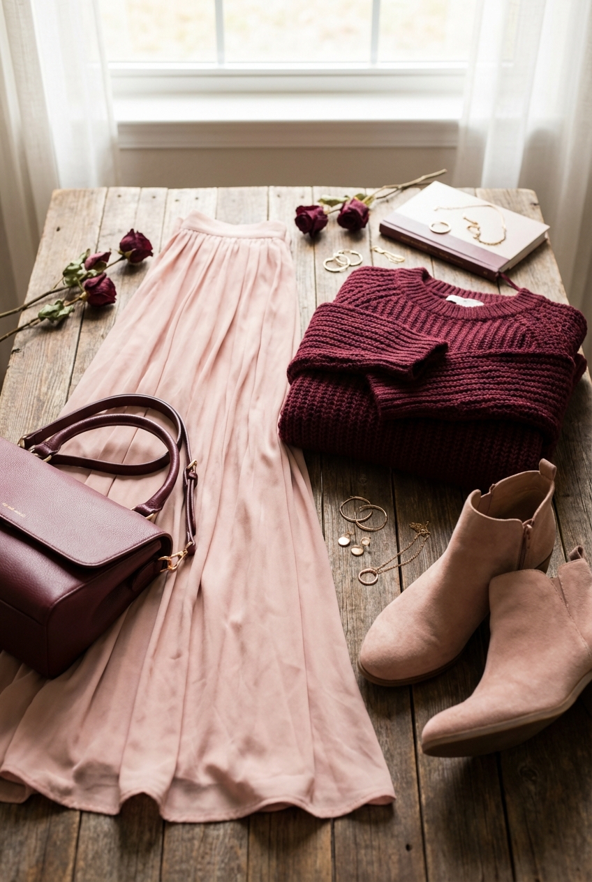 Pairing blush and burgundy is one of the most sophisticated style moves you can make. It balances the masculine energy of deep red with the feminine energy of soft pink, creating a look that is complex and visually satisfying. Whether you choose the drama of a burgundy velvet skirt or the whimsy of blush chiffon, the key lies in managing your proportions and textures.
