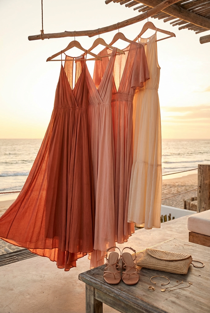 Colors in the warm family—terracotta, blush pink, marigold, and champagne—harmonize beautifully with the sunset. They reflect the ambient light, making your skin look radiant.