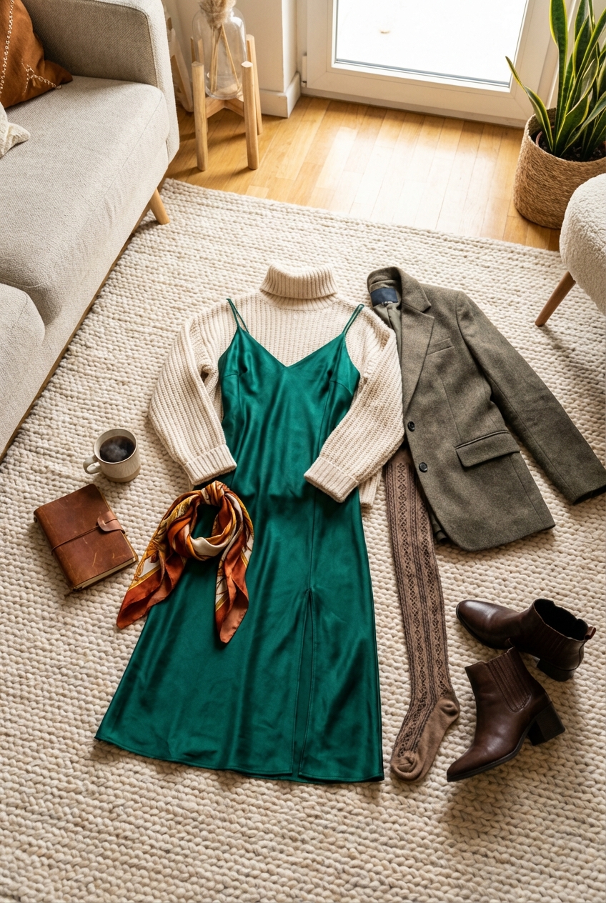 - Neckline Logic: If the slip dress has lace detailing at the chest, use a deep V-neck sweater to frame it. If the dress is plain, a high mock-neck creates a sharper, more modern silhouette.