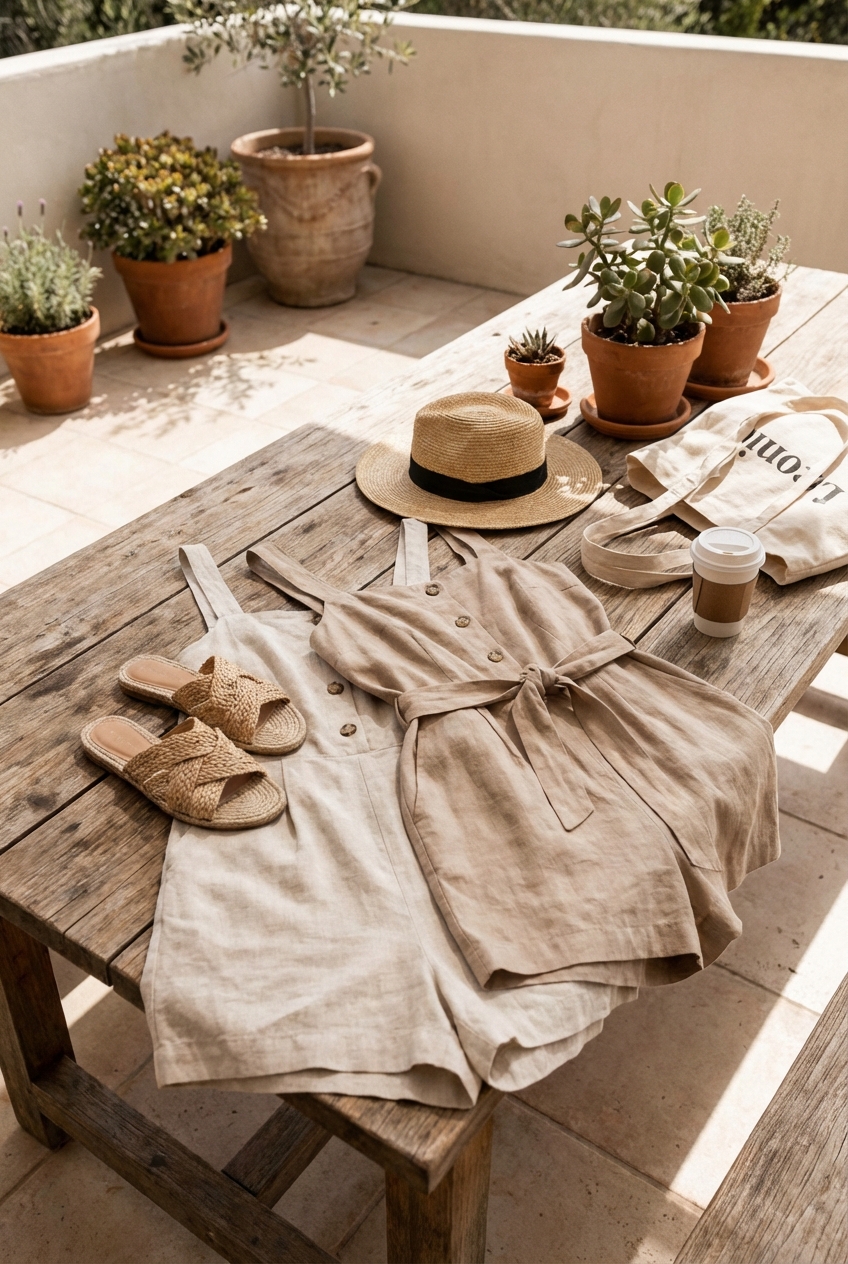 - The “Summer Friday”: Linen utility romper + Lightweight cashmere cardigan draped over shoulders + Leather slides. The texture mix of linen and cashmere screams luxury.