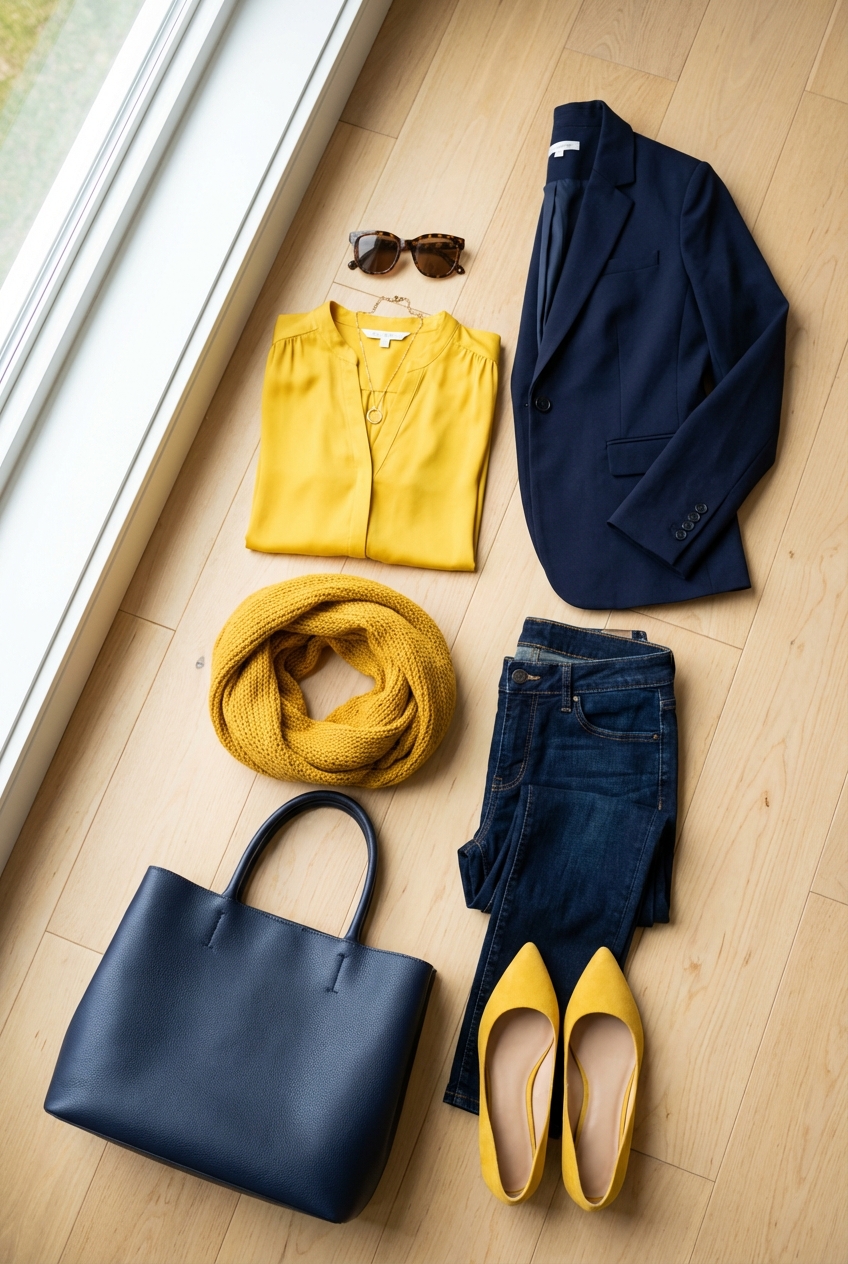 Scarves are your best friend here. A patterned silk scarf containing both navy and yellow can tie an entire outfit together. If you are wearing a yellow dress and navy shoes, tie the scarf around your neck or bag handle to visually connect the top and bottom of your look.