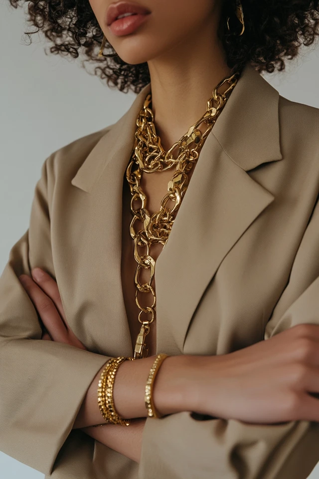 - Pair a structured blazer with a sleek gold choker or layered pendant chains.