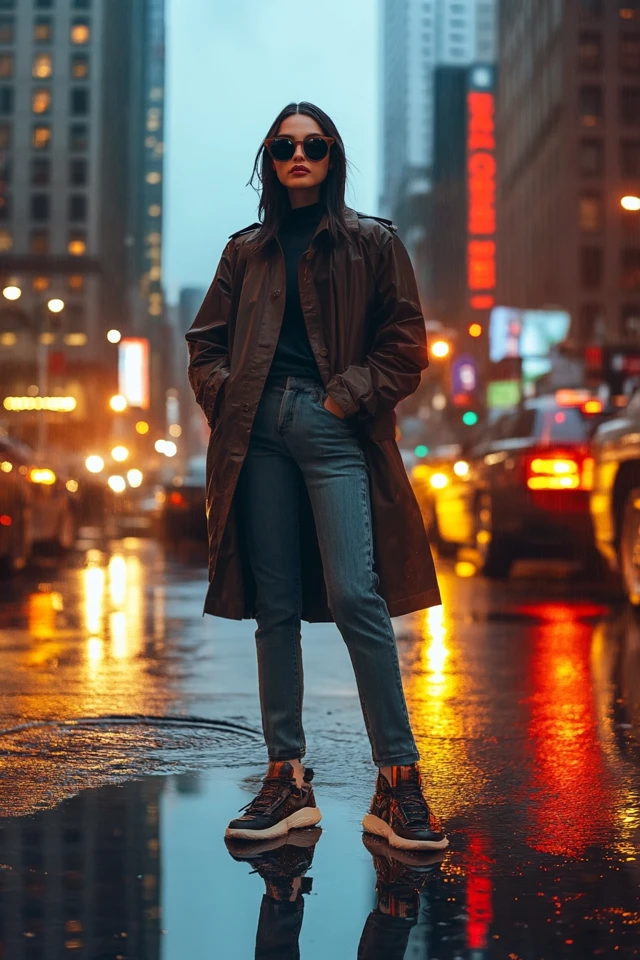 For a polished yet practical look, pair neutral-colored water-resistant sneakers with tailored trousers and a lightweight trench coat. Add a structured tote or backpack to complete the outfit. This look is perfect for urban professionals who need to stay dry without compromising their style.