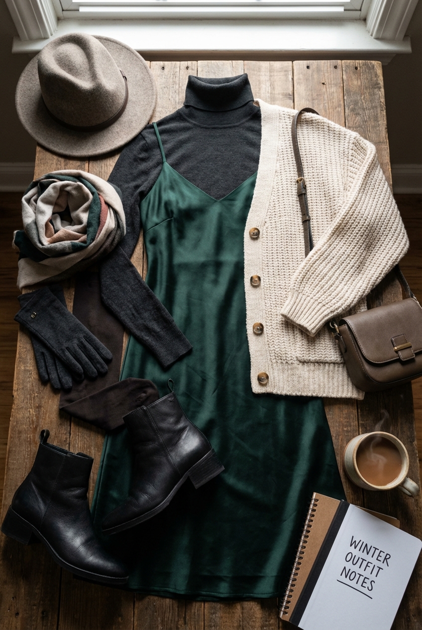 Accessories are the final glue that holds a winter outfit together. Since a slip dress is visually “light,” your accessories need to add visual weight.